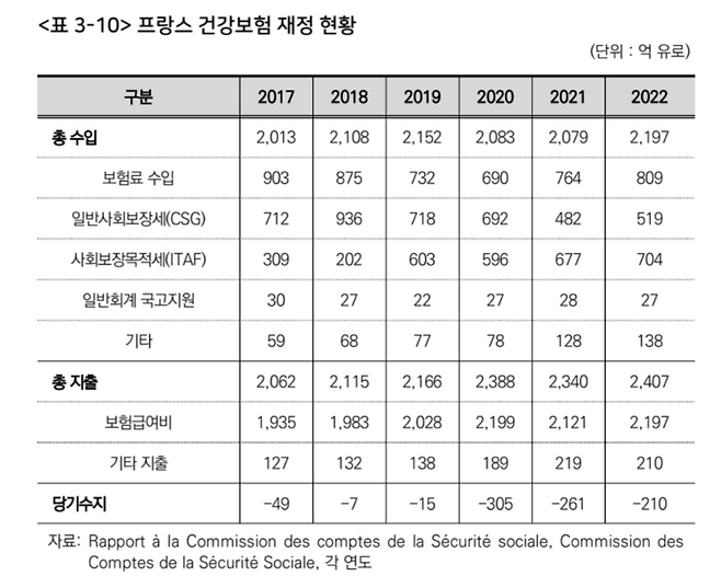 프랑스는 건강보험료가 전체 재원에서 차지하는 비중이 36.8%(2022년 기준)에 에 그친다. 대신 사회보장분담금(CSG)과 사회보장목적세(ITAF) 등 조세 성격의 재원을 폭넓게 활용해 나머지를 충당하고 있다. 노동 인구가 줄어들더라도 보험료 수입 감소가 곧바로 재정 불안으로 이어지지 않도록 재원 구조 자체를 다변화한 셈이다.