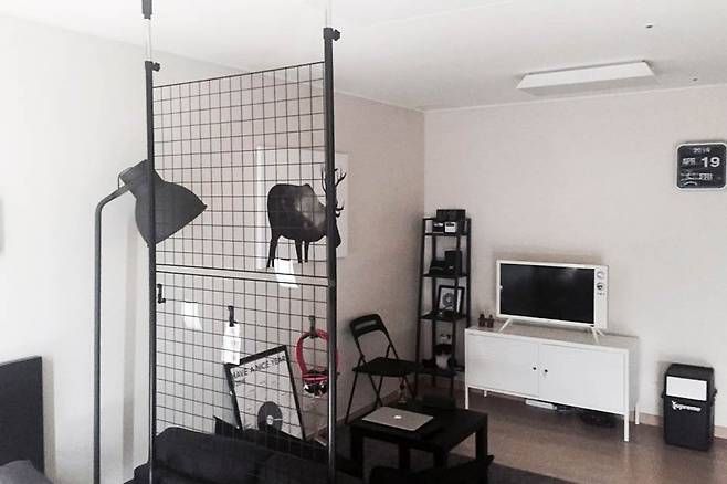원룸의 한계를 넘기 위해 공간 구분을 시도한 이 집은, 네트망 앞에 소파를 두고 플로어 스탠드를 설치함으로써 또 한 번 분위기를 바꿨다. 그레이톤 러그는 바닥에 안정감을 더하지만, 때가 타도 티가 잘 나지 않아 실용적이다. 기능성과 미적 감각을 동시에 담은 선택이 원룸 인테리어의 레벨을 한 단계 끌어올린다.