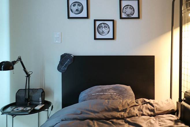 침실 공간에는 포르나세티 액자가 벽을 장식하고, 이케아에서 구매한 작은 협탁 위에는 감성적인 탁상 스탠드가 놓여 있다. 어둠 속에서 조명 하나만 켜두면 책 읽기 좋은 아늑한 분위기가 완성된다.