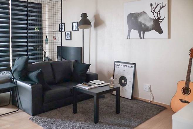 이 집에서는 블랙과 그레이톤의 조합이 집 안 전체를 감싸고 있다. 흔하면서도 가장 세련된 색, 블랙은 정리만 되어 있어도 남다른 인상을 준다. 집주인은 거실과 침실의 기능을 분리하기 위해 아이디어를 발휘했다. 거실 한쪽에는 네트망을 세워 자연스러운 분리벽을 만들고, 그 안을 침실로 꾸며 공간에 깊이를 더했다.