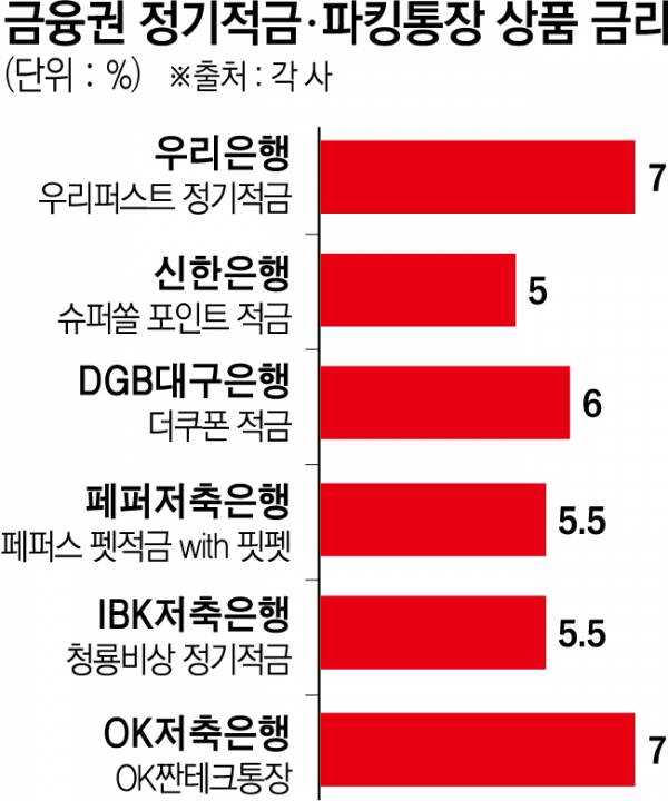 우리은행은 이달 최고 연 7.0% 금리를 제공하는 ‘우리퍼스트 정기적금을 내놨다. 출시 2주 만에 20만 좌나 팔렸다. 신청자가 몰리면서 최근 판매 한도를 70만 좌까지 늘렸다. 기본금리 연 4.0%, 우대금리 3.0%로 최고 연 7%의 금리를 받을 수 있다. 만기는 1년이고 월 최대 50만 원까지 납입할 수 있다.