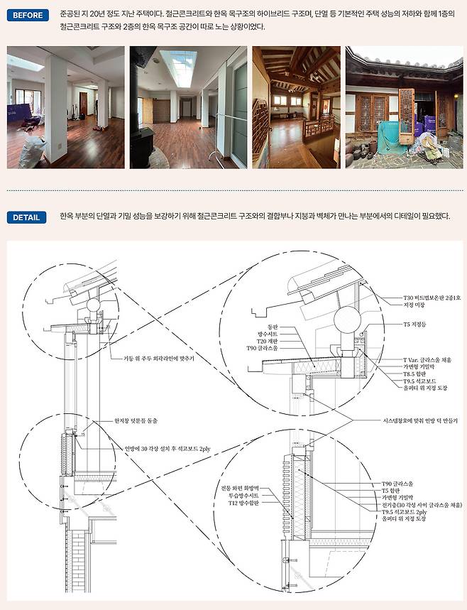 어번디테일 건축사사무소에서 기억하는 주택은 쉽지 않은 현장이었다. 주택은 지하 1층과 지상 1층은 철근콘크리트, 2층은 한옥 목구조로, 비교적 최근인 2002년에 지어졌다. 하지만, 잘 관리되지 못해 목구조 일부는 상해있었고, 중정이나 기둥 등 있어야 할 것이 누락되거나 불법 증축되어 사라졌었다. 1층과 2층은 디자인도 동선도 서로 연결이 불완전했다. 한옥부에서는 단열 등 기본적인 기능도 부실했다. 건축사사무소에는 현대적 요소와 한옥 요소의 자연스러운 조화에 중점을 두어 프로젝트를 진행했다. 우선 1층의 철근콘크리트 구조부와 2층의 한옥부를 단절시킨 ‘사라진 중정’을 복원했다. 복원된 중정에는 그 안에 키 큰 단풍나무를 식재해 자연스럽게 1층과 2층이 이어질 수 있도록 했다. 덕분에 한옥 특유의 정원과 마당 요소를 확보할 수 있었다. 바깥에서는 기존의 콘크리트벽 위 도장이라는 단순한 마감 대신 전국에서 확보한 가지각색의 화강암과 마찬가지로 다양한 컬러의 와편을 이용해 ‘서울 한옥’이라는 일체감을 주었다. 여기에 한옥 전통 개념 중 하나인 차경(借景)을 적극적으로 적용했다. 덕분에 1~2층에 복원된 중정부터 실내 공간 어디에서나 허투루 버려지는 부분 없이 내외부 공간이 연결되는 모습을 만날 수 있다. 이중 특히 전면으로 와이드하게 볼 수 있도록 형성된 창은 전통부터 현대, 자연부터 도시까지 한눈에 담아 보는 이로 하여금 감탄을 자아낸다. 1층에는 손님방과 안방, 욕실을, 2층에는 주방과 거실, 식당, 서재를 배치했다. 인테리어나 구조는 불필요한 장식보다 자연 소재 자체의 멋을 살리는 방향으로 콘셉트를 잡았다. 여기에 건축주가 전국 각지를 오가며 조금씩 모은 전통 가구나 자연 소재들이 조용함 가운데 잔잔한 포인트를 남긴다.