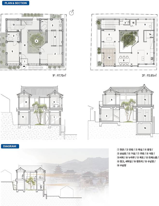구조 : 기초 – 매트기초 / 지하 1층, 지상 1층 – 철근콘크리트 구조 / 지상 2층 – 전통 한식 목구조