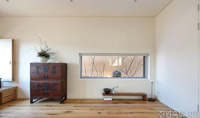 내부마감재 : 벽 – 벤자민무어 수성페인트, 한지마감 / 바닥 – 지복득 원목마루, 윤현상재 포세린 타일 / 천장 – 벤자민무어 수성페인트, 한지 마감, 연등 천장