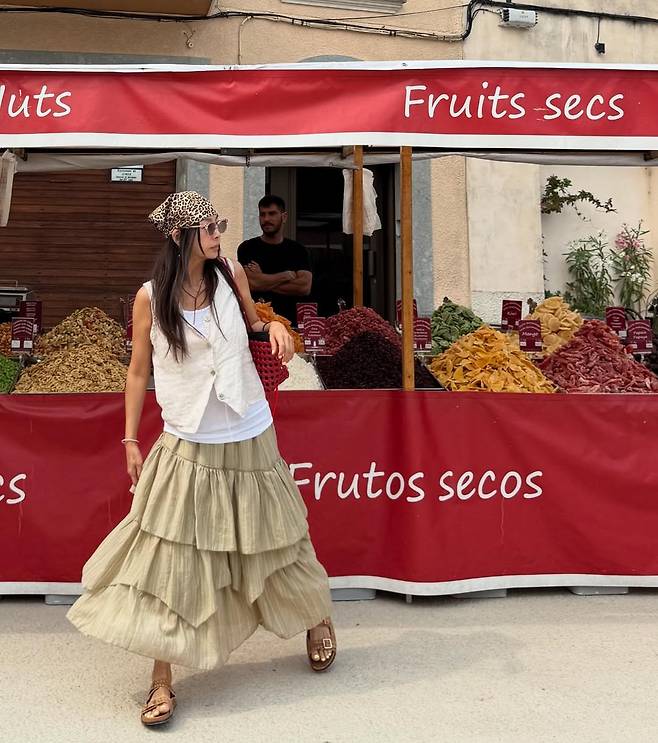 고급스러운 선글라스와 리조트 감성의 샌들도 센스 있게 매치해 여유로운 분위기를 더했다.