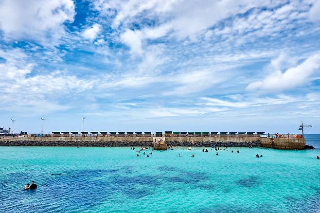 제주 바다 중 스노클링과 물놀이의 성지로 불리는 판포포구! *청물 시즌에 맞춰 방문하면 지중해가 부럽지 않을 정도의 환상적인 제주 바다 빛깔을 만날 수 있어요.