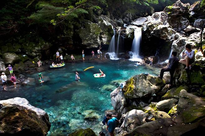 제주 바다만이 물놀이의 전부라는 편견을 깨뜨려주는 현지인만 아는 곳! 여름에만 개방되는 도민들의 비밀 놀이터 같은 원앙폭포에서는 제주 바다와는 또 다른 매력의 물놀이를 경험할 수 있어요.
