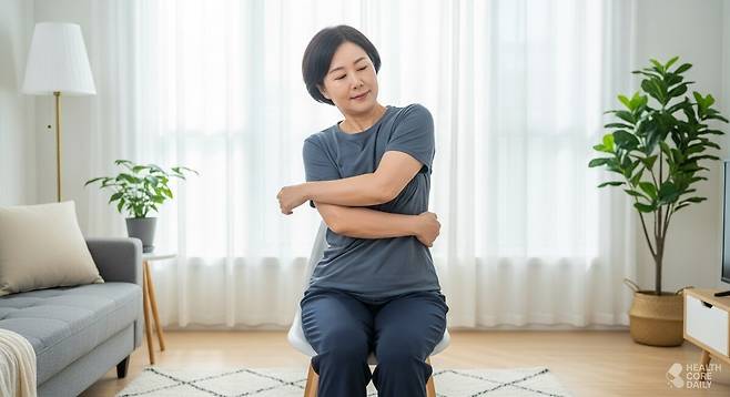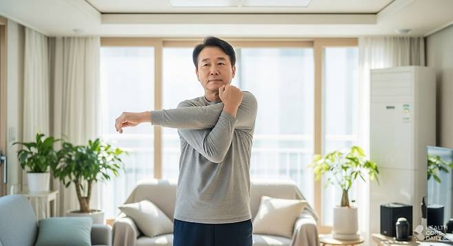 5. 어깨 관절을 풀어주는 '팔 교차 스트레칭'