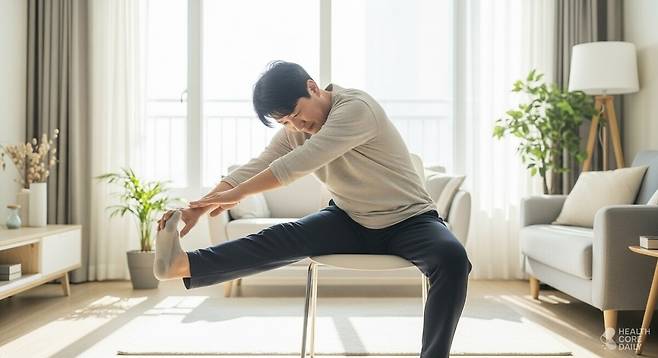 의자나 침대 가장자리에 앉아 한쪽 다리를 앞으로 쭉 뻗는다. 발끝을 몸 쪽으로 당기며, 허리를 곧게 편 상태로 상체를 살짝 앞으로 숙인다. 허벅지 뒤가 당기는 느낌이 들면 그 자세를 10초 이상 유지한다. 반대쪽 다리도 같은 방법으로 반복한다. 양쪽 각각 10회씩 1세트로 구성해 하루 3세트 정도 실시하면 좋다.