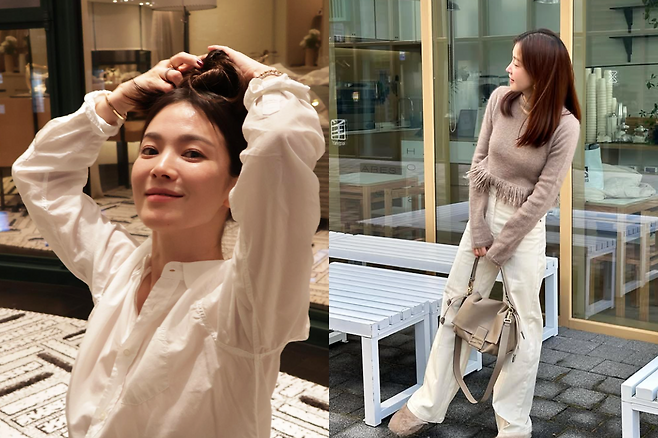 송혜교는 블랙 톤온톤 스타일링에 맘마백을 매치하며 자연스럽고 편안한 분위기를 연출했다.