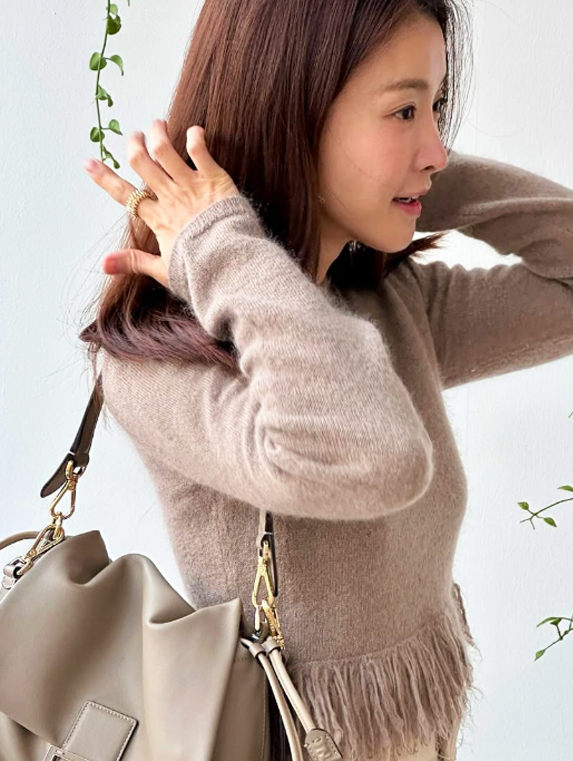 반면, 이시영은 베이지톤의 내추럴한 룩과 함께 착용해 차분하면서도 고급스러운 느낌을 강조했다.
