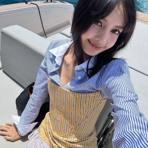 셔츠와 스커트를 모두 스트라이프 패턴으로 맞춰 입은 윈터. 셔츠의 밑단을 묶어 크롭트 톱처럼 연출한 스타일링이 인상적입니다. 어깨 위에 걸친 스웨터와 라피아 소재의 가방까지 들고 그의 룩과 가장 잘 어울리는 장소인 요트 위에서 마치 화보의 한 장면 같은 순간을 연출했어요.
