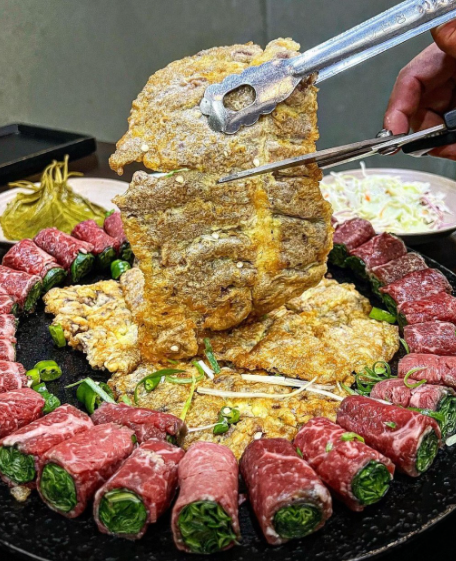 파주 프로방스 마을 옆에 위치한 인기 맛집!솥뚜껑 위에서 고기 말이를 직접 구워 먹는 재미까지 더해져요.