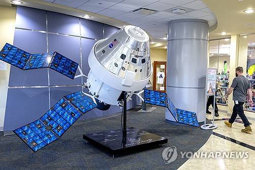 epa11947479 A model of the Artemis II Orion spacecraft is displayed at the entrance of the Neil Armstrong Operations, where the real NASA Orion spacecraft is being assembled at the Kennedy Space Center in Titusville, Florida, USA, 07 March 2025. According to NASA, Artemis II will send a crew of four astronauts on a journey around the Moon and bring them back safely, paving the way for future long-term human exploration missions to the lunar surface and eventually Mars. EPA/CRISTOBAL HERRERA-ULASHKEVICH