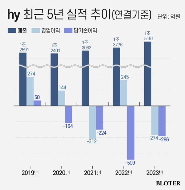 하지만 체질개선 효과는 안갯속이다. 금융감독원 전자공시시스템에 따르면 hy는 2023년 연결기준 영업손실 274억원으로 흑자전환 1년 만에 적자로 돌아섰다. 기간을 넓혀보면 hy의 영업이익 규모는 2022년을 제외하곤 2017년부터 내리막이고, 당기순이익 역시 2020년부터 적자를 지속해왔다. 매출도 2005년 1조원을 돌파한 후 18년째 1조원대에 머무르고 있다. 가장 최근인 2023년 매출은 1조5191억원이었다.