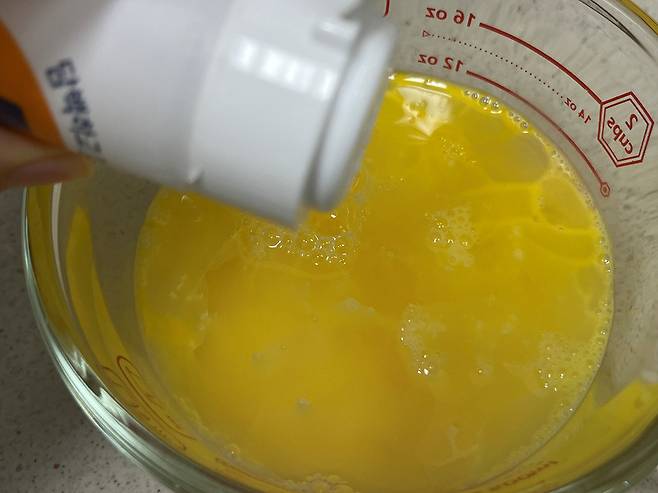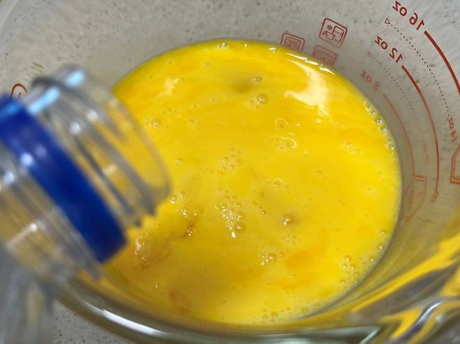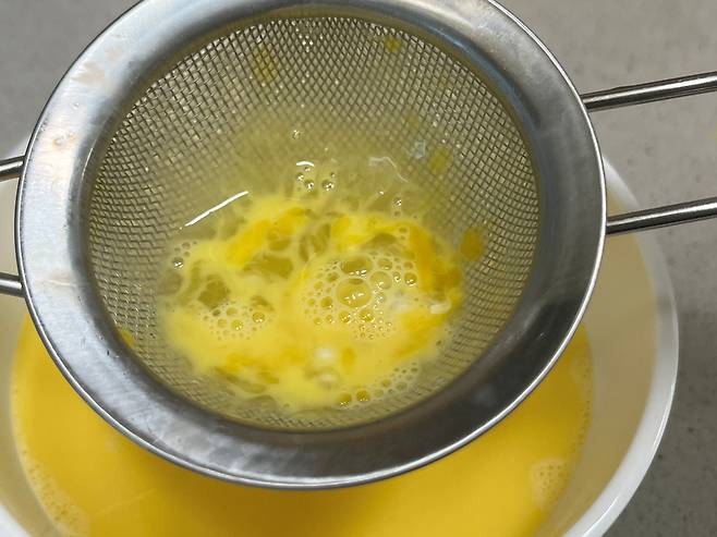 계란은 한 번 채에 걸러서 알끈을 제거해 주세요. 이 과정을 거쳐야 훨씬 부드럽고 푸딩 같은 계란찜을 만들 수 있습니다.