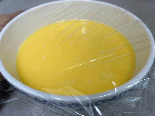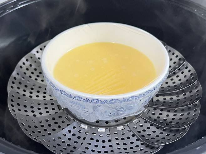 랩을 씌운 다음 찜기에 넣으세요. 그리고 계란에 기포가 있으면 모두 터뜨려 없애야 표면이 고르게 나옵니다.