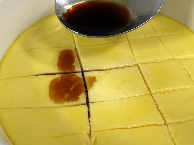 간장과 참기름을 섞은 다음 계란찜 위에 뿌려 주세요. 간도 되고 고소한 풍미도 더해집니다.