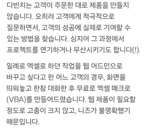 대신 저희는 현재처럼 성실하고 전문적인 모습으로 인입을 늘려 가려 합니다. “다빈치는 개발자 같지 않고, 제대로 문제를 해결해 주는 파트너다”라는 평판을 쌓으면, 더 많은 기업들과 협업할 수 있는 기회가 생길 것이라고 봅니다.