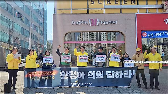 정의당 대전시당은 23일 오후 대전 유성구 지족동 황정아 의원 사무소 앞에서 '전력망특별법 찬성, 345kV 초고압 송전탑 입장 모호, 황정아 국회의원은 답하라'는 내용의 기자회견을 열고, 황 의원에게 보내는 공개질의서를 발표했다.