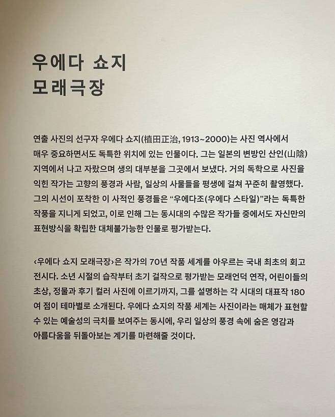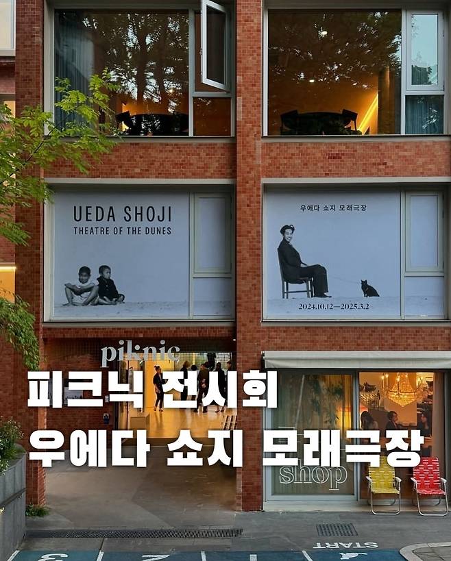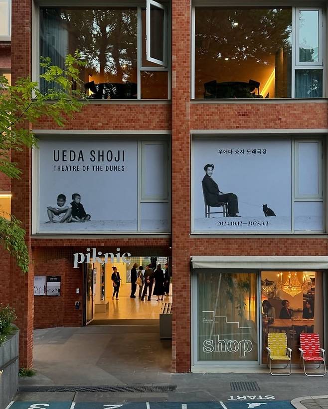 피크닉은 20세기 일본 사진계를 대표하는 작가이자 연출 사진의 선구자인 우에다 쇼지의 단독 전시 '우에다 쇼지 모래극장'을 선보인다. 우에다 쇼지는 일본의 소박한 시골 지역인 돗토리현에서 나고 자라 평생 대도시가 아닌 고향에 머무르며 작업한 특이한 이력의 소유자다. 특히 지역의 독특한 풍광인 바닷가와 거대한 모래언덕은 그가 70년 가까이 즐겨 촬영한 장소로, 마그리트나 달리를 연상시키는 초현실적인 분위기를 만들어내는 데 결정적인 역할을 한다. 이러한 환경 속에서 어떠한 유행이나 유파에도 속하지 않고 스스로 확립해 나간 우에다의 독자적인 스타일을 서구에서는 '우에다조'라는 고유명사로 부른다.