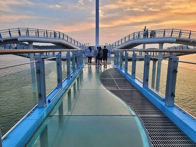 목포 스카이워크는 목포 앞바다 위에 놓인 길이 120m의 전망형 보행로로 전라남도 목포를 대표하는 여행 명소다. 바닥의 2/3 이상이 투명 강화유리로 제작되어 있어 마치 바다 위를 걷는 듯한 아찔한 스릴을 느낄 수 있다. 곳곳에는 구멍이 송송 뚫린 스틸 발판도 있어 아래로 바닷물이 보이며 더욱 짜릿한 체험을 선사한다.