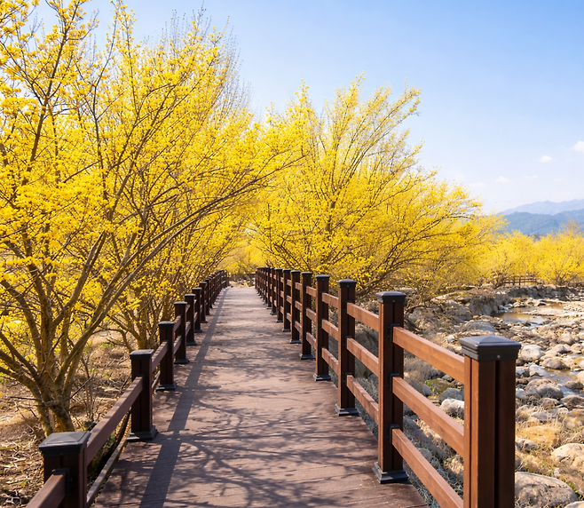 산수유는 한 장면으로 설명하기 어렵습니다. 반곡마을에서는 계곡 물 위로 노란 꽃이 반영되는 장면이 특히 유명합니다. 맑은 물과 바위, 꽃이 어우러져 사진 명소로 손꼽힙니다.