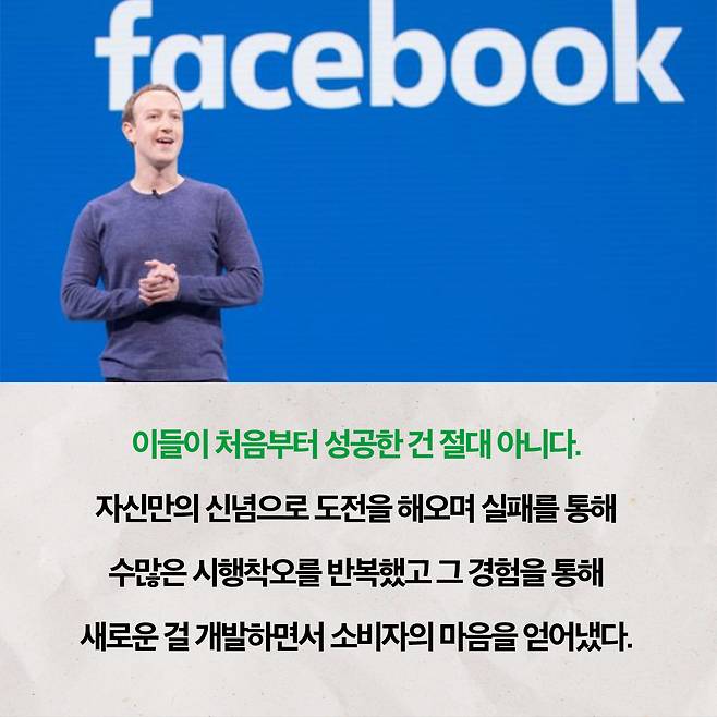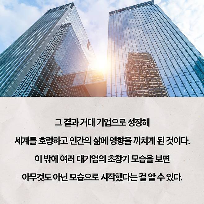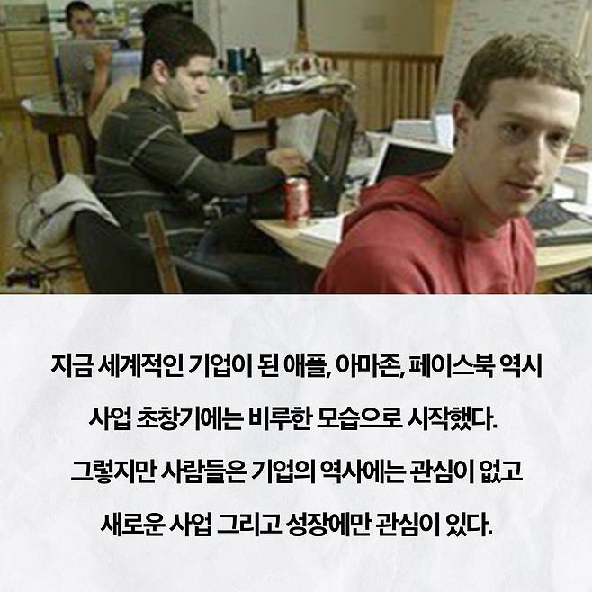 모든 기업에는 초창기 모습이 있습니다. 우리가 알고 있는 초거대 기업조차 초창기 모습을 보면 볼품없죠. 모든 성공에는 과정이라는 게 있습니다. 그 과정을 들여다 보면 승승장구만 있는 게 아니기에 우리는 시도하고 실패하는 것을 두려워하는 게 아니라 오히려 훈장으로 여기며 끊임없이 도전해야 합니다.