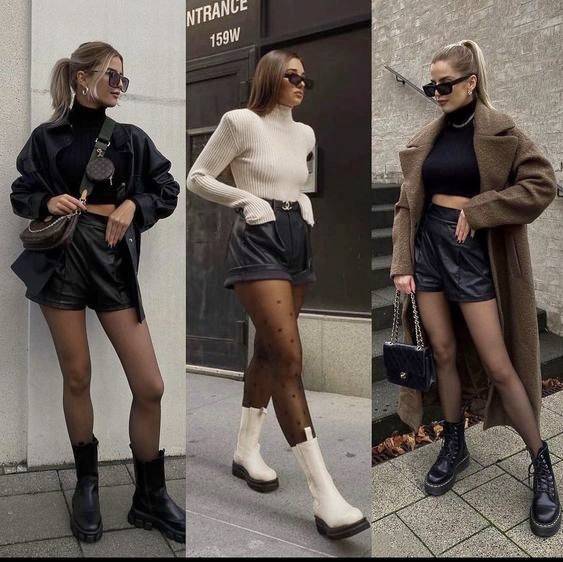 시크한 매력을 주는 레더 자켓과 숏팬츠에 블랙 선글라스, 숄더백 그리고 골드 악세사리로 패셔너블한 부츠룩 완성!