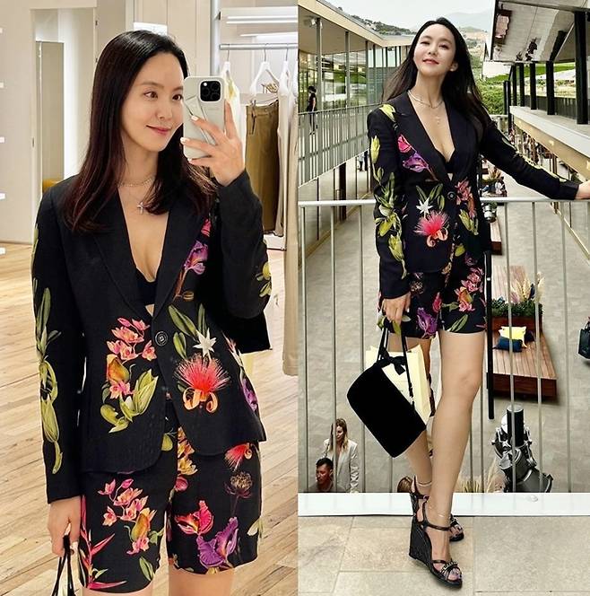 공개한 사진에서 박지윤은 속옷이 노출된 꽃무늬 재킷과 꽃무늬 반바지 슈트룩으로 과감하면서도 섹시한 스타일로 눈길을 끌었다.