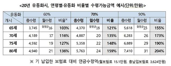 예를 들어 40세에 가입해 매달 15만1천원의 보험료를 20년간 모두 3천624만원을 납입해 사망보험금 1억원 상당의 종신보험계약을 보유한 계약자는 사망보험금 70% 유동화와 20년 지급을 선택할 경우, 65세부터 받기 시작하면 납입한 보험료의 121%인 월평균 18만원을, 80세부터 받기 시작하면 납입한 보험료의 159%인 월 24만원을 연금으로 매달 수령할 수 있고, 남은 3천만원의 사망보험금도 수령이 가능하다.