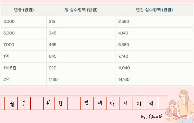 먼저, 연봉별 실수령액을 표로 정리해봤어요.