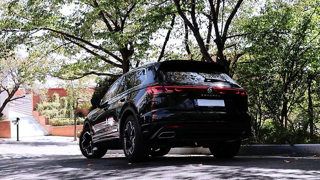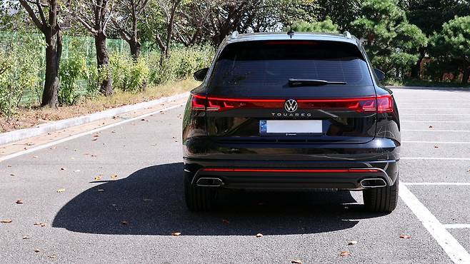 뒷모습도 이전 모델에 비해 제법 스포티한 인상으로 변했다. 특히 페이스리프트와 함께 테일램프 커버가 하나로 통합되었다. 전면 라이트 스트립과 통일감을 갖추는 수평 형태의 LED 그래픽이 추가되었고, 역시 3eyes 패턴이 접목된 모습이다. 그 외 테일게이트나 범퍼는 무난한 형태를 보인다. 트윈 머플러 팁이 채택되었고, 수평형으로 배치된 리플렉터가 더욱 깔끔한 인상을 남긴다. 지금껏 폭스바겐 투아렉은 중후하고 강인한 성격만을 추구해온 반면, 더 뉴 투아렉 페이스리프트는 역동적인 분위기가 더욱 강해져 보인다.