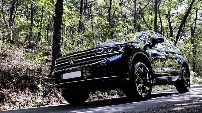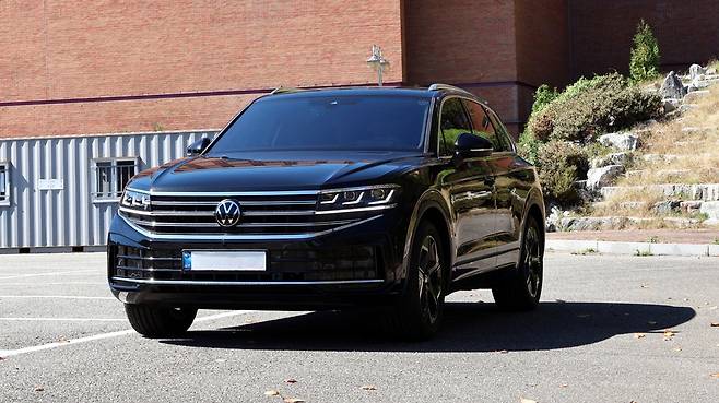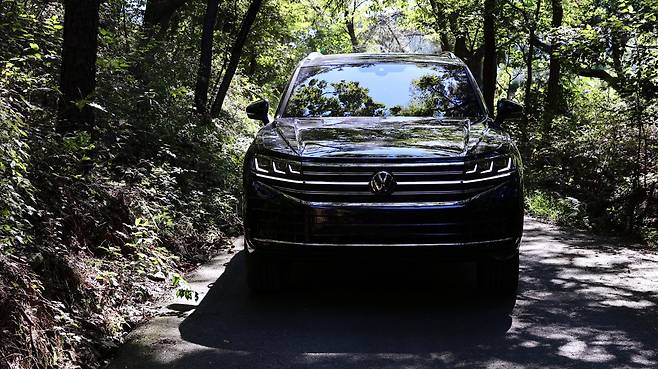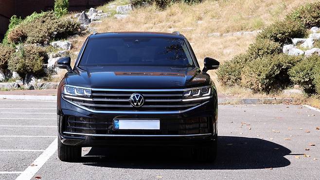 투아렉 페이스리프트의 첫인상은 더욱 웅장해졌다. 라디에이터 그릴의 면적이 넓어졌고, 헤드램프에는 '3eyes'라는 신규 DRL이 채택되었다. DRL과 라디에이터 그릴 바가 하나로 연결되는 디자인은 폭스바겐 특유의 간결함과 정교함이 나타난다. 페이스리프트 이후 '라이트 스트립'이 추가되어 더욱 개성적인 분위기가 연출되기도 한다. 시승 차량은 R-라인이 아닌 기본 사양이지만, 범퍼 형상이 꽤나 스포티하게 꾸며져 있다. 어퍼 가니시까지 유광 컬러로 마감되었고, 수평 형태의 크롬 라인이 정돈된 이미지를 구현한다.
