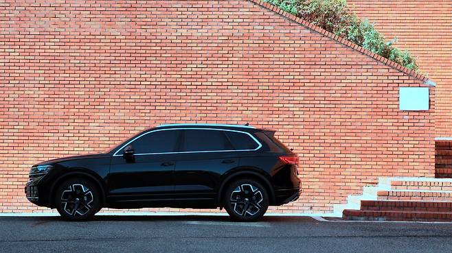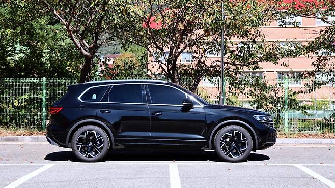 폭스바겐의 MLB 플랫폼은 4륜 구동을 중점으로 엔진을 차축 앞에 배치하는 독특한 레이아웃을 지닌다. 때문에 동급 SUV에 프런트 오버행이 긴 편, 대신 그만큼 보닛 길이가 웅장해 보인다. 경사각이 낮은 D 필러와 함께 역동적인 윤곽선을 지니게 된다. 넓게 확대되어 있는 측면 창이 전형적인 패밀리 SUV의 분위기를 갖춘다. 크롬 몰딩과 루프랙이 조화롭고, 또 기본 20인치 블랙 휠에도 크롬 색상 포인트가 추가되어 있다. 투아렉은 온전한 아치 형태의 휠 하우스가 개성적이기도 하다. 휠 하우스 부근은 플라스틱 소재로 마감된 모습이다.