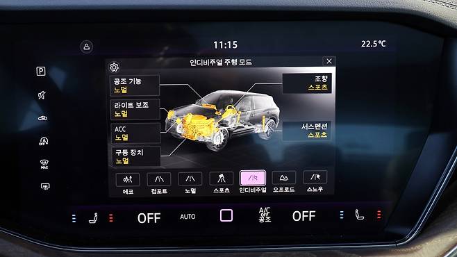 스포츠 모드에서는 하체가 확실하게 단단해진다. 컴포트 모드에 비해 노면 피드백을 확실하게 전달해 주고, 급격한 코너나 회피 기동에서는 기존 컴포트 세팅과 확실히 움직임이 억제된다. 디젤 엔진과 변속기는 시종일관 부드러운 느낌이며, 스포츠 모드에서도 그 예민함이 크게 차이나진 않았다. 기본적으로 엑셀을 깊게 밟으면 튀어나가는 강력한 토크감이 투아렉의 재미라 볼 수 있다. 다만 저 RPM 토크가 높은 디젤 엔진 특성상, 패들 시프트를 활용해가며 자극적인 출력을 즐기는 건 어렵다. 별도의 사운드 같은 것도 더해지진 않는다.