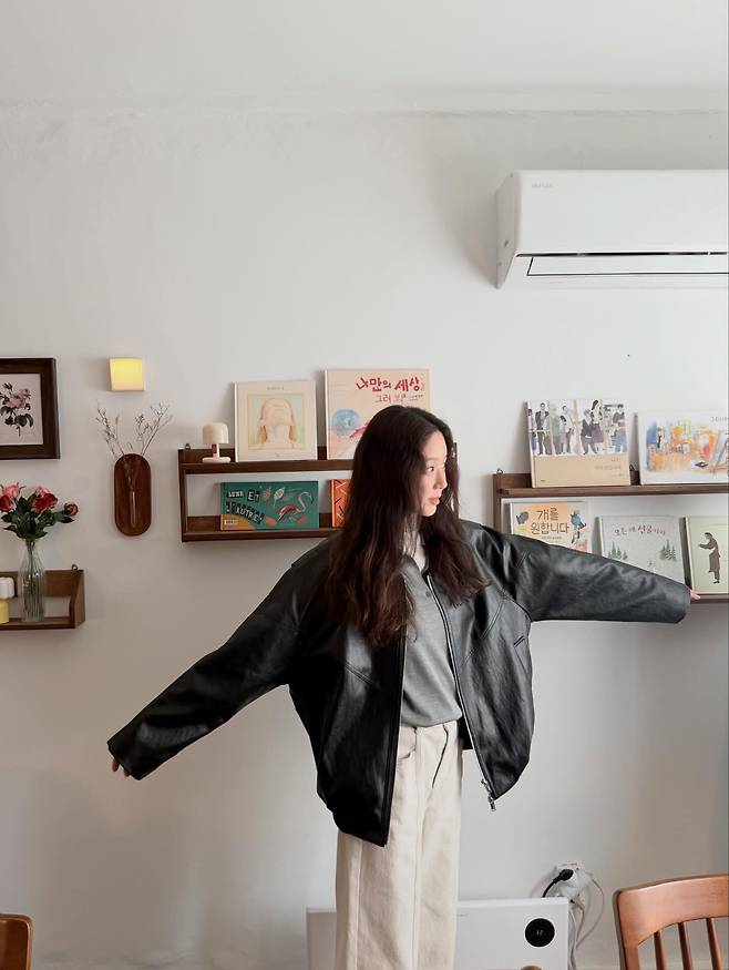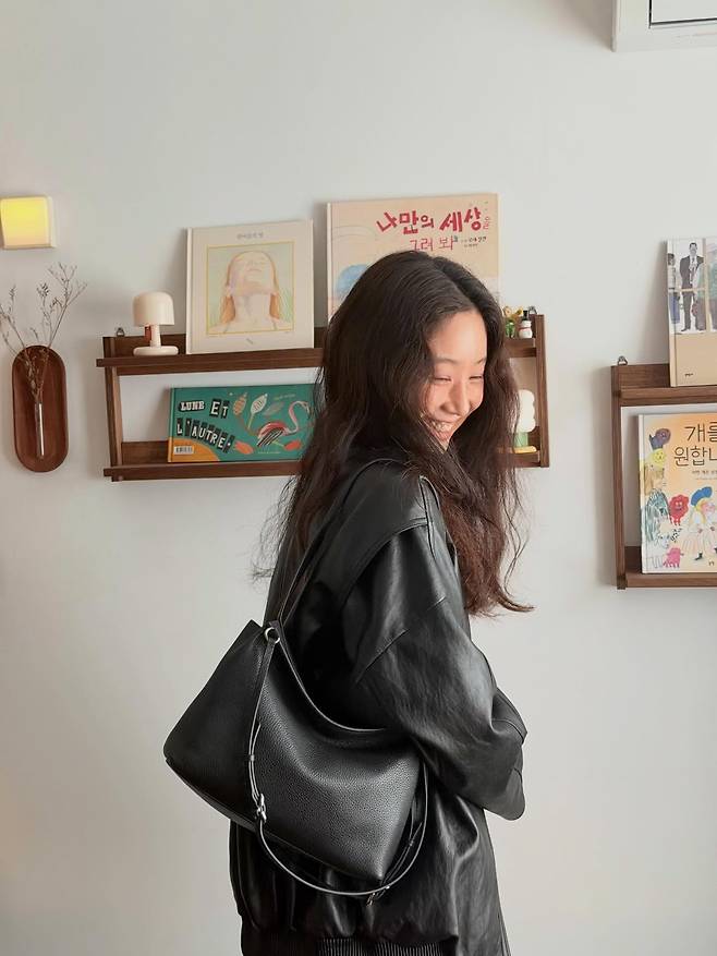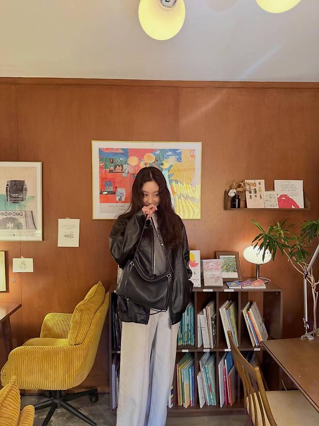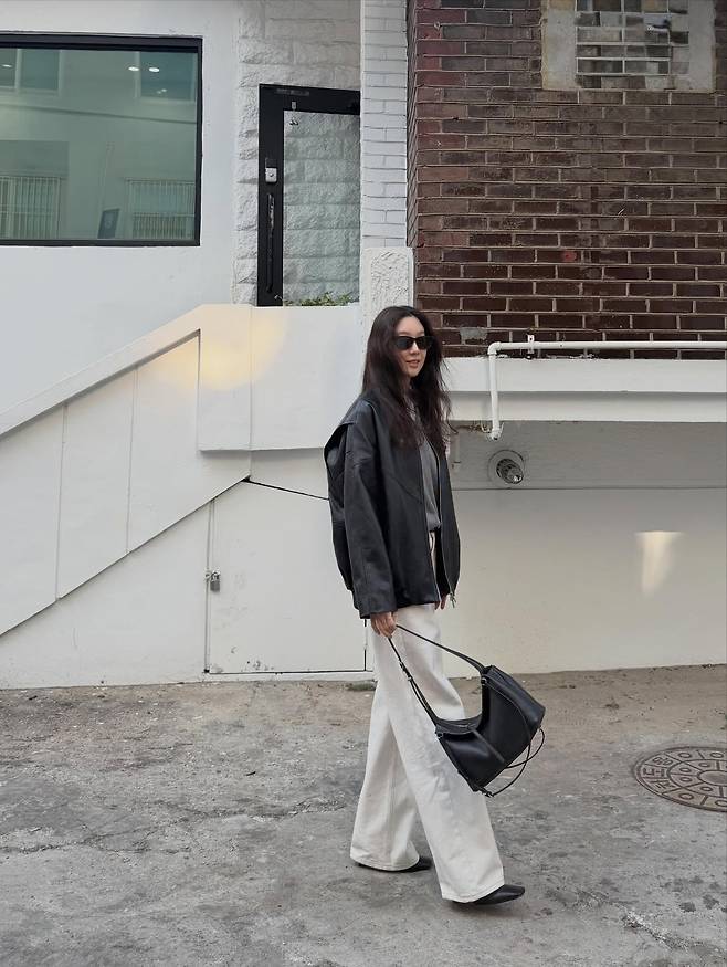 여기에 시크하게 든 검은색 가죽 가방과 발끝을 정돈해 주는 블랙 슈즈는 전체적인 차림에 통일감을 주며, 그녀만의 감각적인 패션 센스를 완성하는 영리한 포인트가 됩니다.