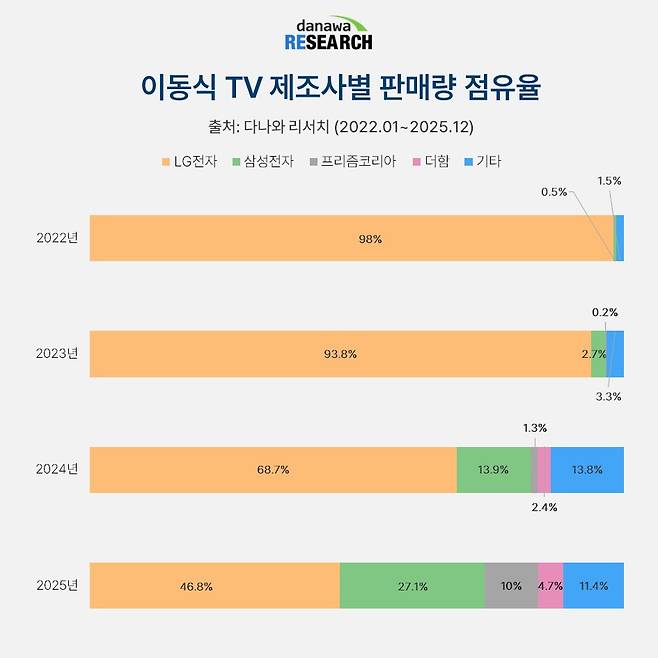 몇 년 전 까지만 해도 "이동식 TV=스탠바이미"였다. 이는 수치로도 증명할 수 있다. 이동식 TV 시장이 막 움트고 있을 때인 2022년, LG전자의 점유율은 무려 98%였다. 다음 해, 2023년 역시 상황은 다르지 않았다. 여전히 LG전자가 90% 이상의 압도적인 점유율을 가져가며 시장을 독점했다.
