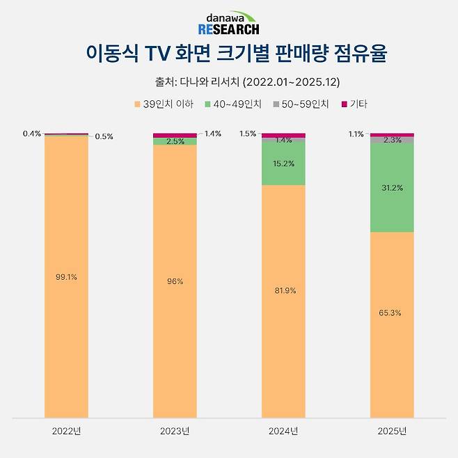 2022년과 2023년에는 39인치 이하의 제품들이 주류를 이뤘지만, 2024년부터 40인치 이상의 제품이 시장을 조금씩 침식했고, 2025년에 들어서는 30% 이상의 점유율을 차지하는 데 성공했다. 4K 고화질 영상의 선호도가 높아짐에 따라 화질 체감도가 높은 40인치대 제품의 수요가 늘어난 것이다.