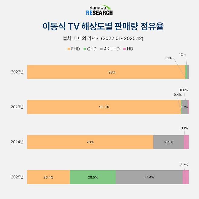 이동식 TV가 처음 나왔을 때 소비자의 불만은 '기대 이하의 화질'이었다. 4K 콘텐츠가 넘쳐나는 시대에 FHD를 지원하니 소비자들의 마음에 차지 않았던 것이다. 다나와 리서치 데이터에 따르면 이동식 TV의 FHD 화질은 2023년까지 이어지다, 2024년 4K UHD를 지원하는 신제품이 나오면서 크게 업그레이드됐다.
