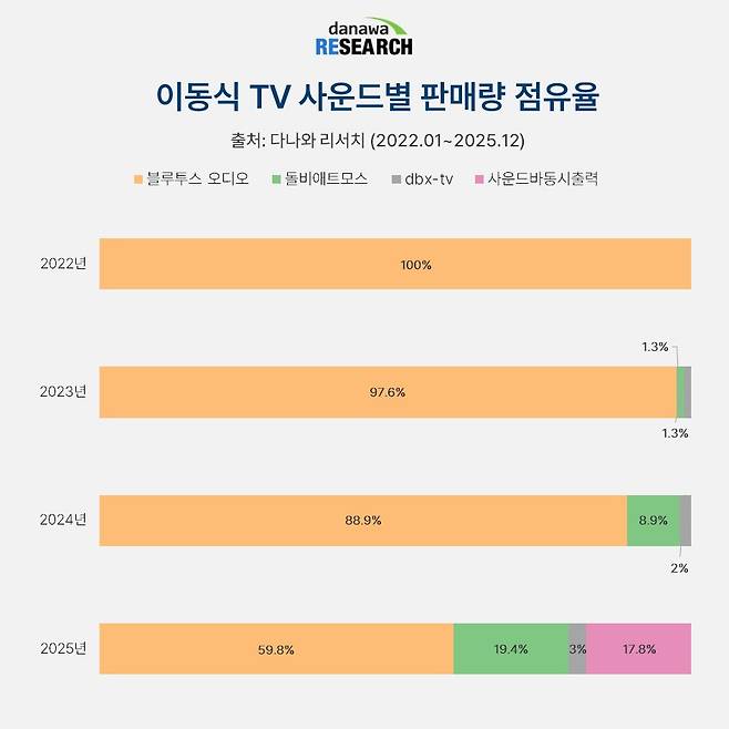 2022년에는 블루투스 오디오 기능만 제공했지만, 2025년에는 돌비애트모스, 사운드바 동시출력, dbx-tv까지 다양한 기능이 추가되면서 이동식 TV의 사운드 품질은 발전하고 있다.