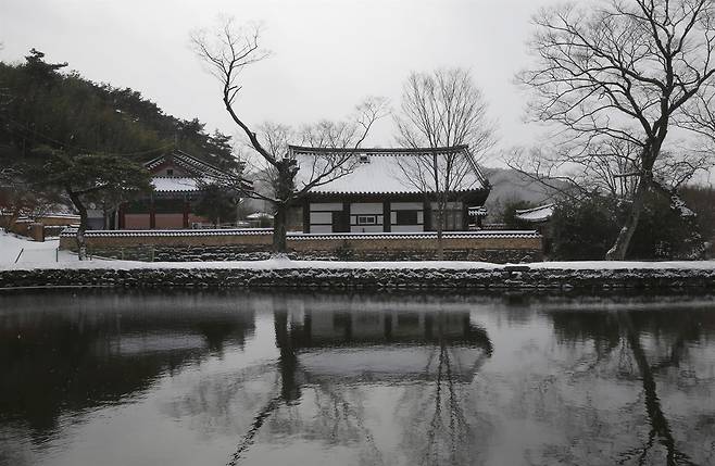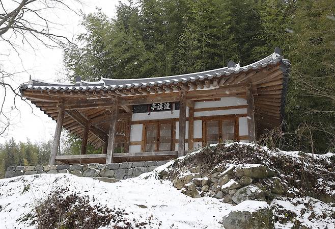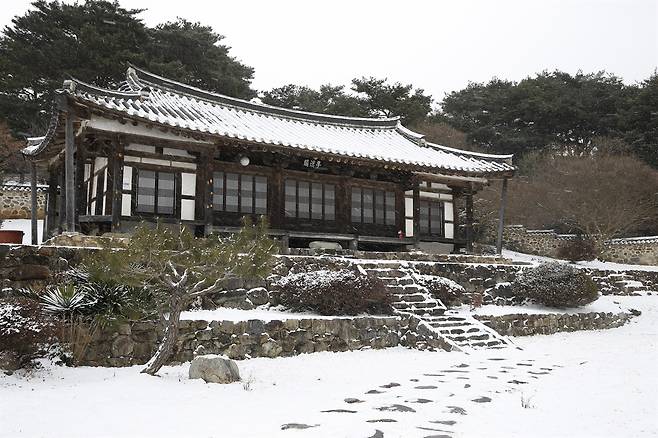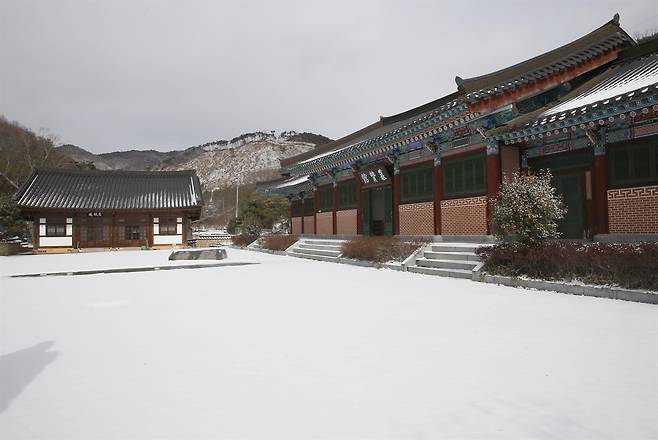 | ▲ 이서의 재실 몽한각의 설경. 앞면 5칸, 옆면 2칸의 팔작지붕을 얹었다. 지난 1월 24일 풍경이다. |
