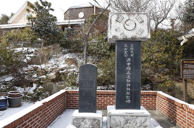 | ▲ 애국지사 김제중 기념비. 미암박물관이 자리한 장산마을에 자리하고 있다. 지난 1월 24일 모습이다. |