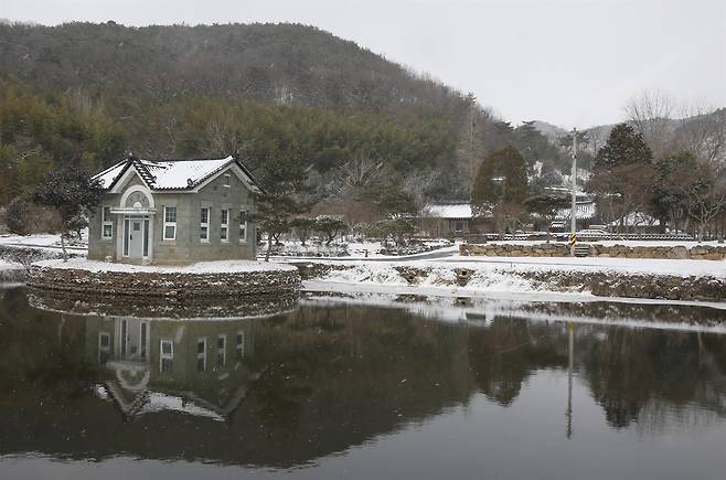 | ▲ 장산마을의 연못에 반영돼 비치는 미암박물관 풍경. 지난 1월 24일이다. |