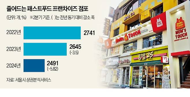 1일 서울시 상권 분석 서비스에 따르면 올해 2분기 서울지역 패스트푸드 프랜차이즈 점포는 2491곳으로, 전년 동기(2645곳) 대비 5.82% 줄었다. 일반 식당과 프랜차이즈 식당을 합친 전체 패스트푸드 식당 감소율(3.65%)보다 더 가파른 추세다. 고물가 장기화 속 배달 수수료까지 오르자 경영난에 직면한 음식점들의 폐업이 더 가속화하고 있는 것으로 풀이된다.