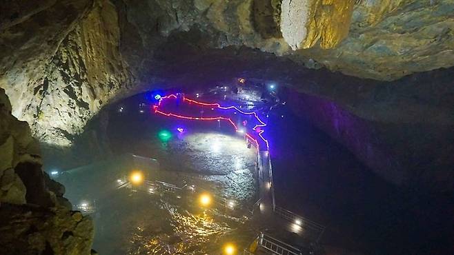 관람은 전동차를 타고 시작되는데, 마치 영화 속 탐험가가 된 듯한 느낌으로 지하 세계로 미끄러지듯 들어가는 순간이 굉장히 인상적이에요. 내부는 전부 조명으로 은은하게 비춰지고, 반짝이는 석순과 흐르는 지하수, 물소리와 동굴 특유의 정적이 어우러져 지하 미술관 같은 분위기를 만들어줘요.