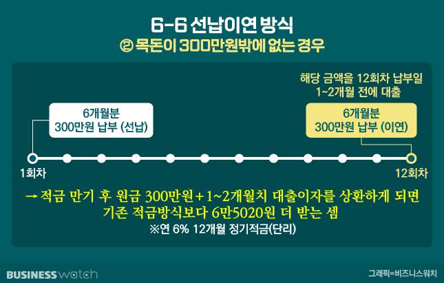 먼저 선납이연의 대표적인 방법 중 하나인 '6-6'은 1년 적금을 기준으로 1회차에 6개월분을 미리 납입(선납)하고 나머지 6개월분은 12회차에 납입(이연)하여 1개월 후 만기가 오면 원금과 이자를 받는 방식이다.