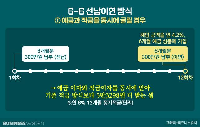 예를 들어 목돈이 600만원 있는 상태에서 '6-6' 방식으로 굴린다고 가정해보자. 이 방법을 이용할 경우 1회차에 우선 6개월 납입 금액인 300만원을 선납한다. 이후 가지고 있는 나머지 300만원을 연 4.2%, 6개월 만기의 예금 상품에 넣어 두면 같은 돈으로 예금을 하나 더 든 것과 같은 효과를 누릴 수 있다. 즉 단순하게 적금을 들었을 때보다 5만3298원(세후 기준)을 더 받는 셈이다.