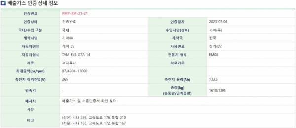 기아 레이 전기차 버전의 주행거리와 제원이 공개됐다. 환경부 고시에 따르면 신형 레이 EV는 최고출력 87마력,1회 충전 주행거리 복합 210km(도심 238km, 고속 176km) 인증을 마쳤다. 승용과 밴 두 가지로 운영되며 35.38kWh LFP 용량의 배터리와 보그워너 통합형 구동모듈을 장착했다.