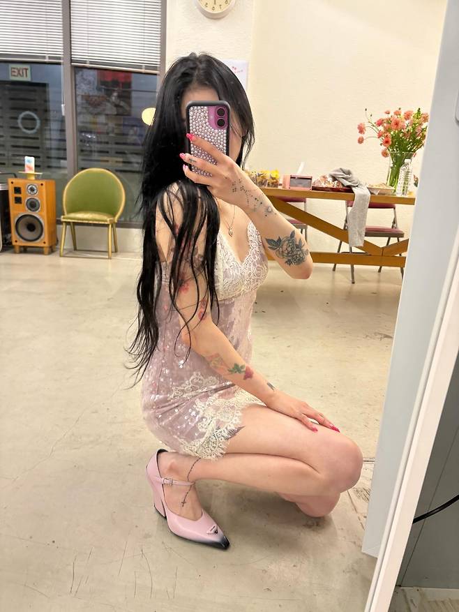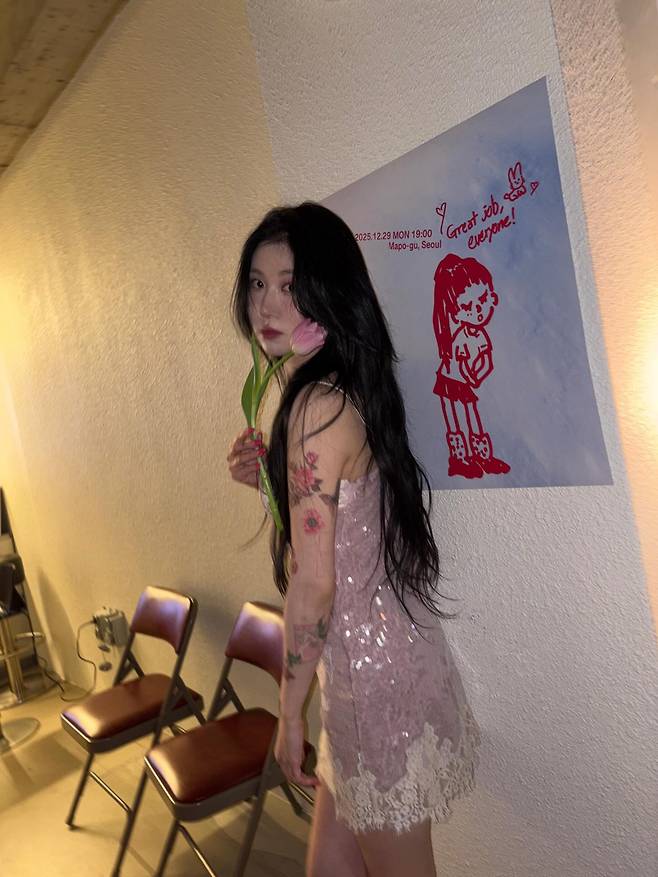 가녀린 어깨 라인과 팔을 따라 새겨진 화려한 타투들이 옷의 분위기와 절묘하게 어우러져, 오직 백예린만이 소화할 수 있는 유니크한 스타일을 완성했답니다.